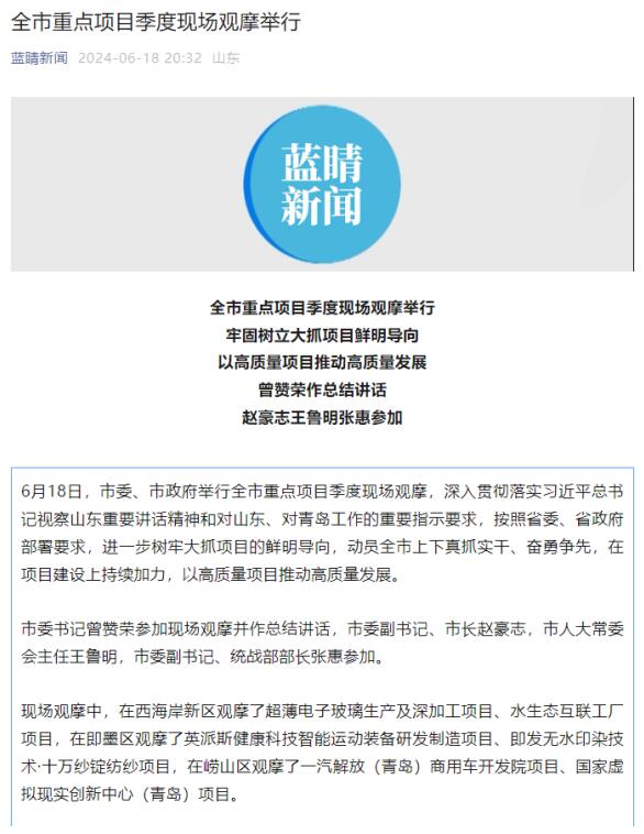 市委書記曾贊榮等領(lǐng)導(dǎo)聽取了項目建設(shè)的情況匯報,并發(fā)表講話,強調(diào)要深入貫徹落實習(xí)近平總書記視察山東重要講話精神和對山東、對青島工作的重要指示要求,按照省委、省政府部署要求,進一步樹牢大抓項目的鮮明導(dǎo)向,動員全市上下真抓實干、奮勇爭先,在項目建設(shè)上持續(xù)加力,以高質(zhì)量項目推動高質(zhì)量發(fā)展。