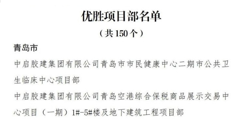 12月6日,山東省住房和城鄉(xiāng)建設(shè)廳官網(wǎng)公布了2024年度全省住房城鄉(xiāng)建設(shè)系統(tǒng)重點(diǎn)工程“聚焦新質(zhì)生產(chǎn)力 服務(wù)高質(zhì)量發(fā)展”創(chuàng)新創(chuàng)優(yōu)勞動競賽獲獎名單,中啟膠建集團(tuán)有限公司榮獲“優(yōu)勝集體”稱號,青島市市民健康中心二期市公共衛(wèi)生臨床中心項目部和青島空港綜合保稅商品展示交易中心項目(一期)1#-5#樓及地下建筑工程項目部被評為“優(yōu)勝項目部”稱號。