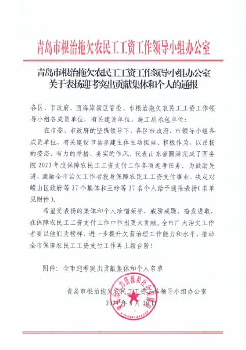 2024年,在公司領(lǐng)導(dǎo)的正確帶領(lǐng)下,在各單位各項(xiàng)目的大力支持和相關(guān)工作人員辛勤付出下,公司在保障農(nóng)民工工資支付工作方面先后圓滿完成了各項(xiàng)調(diào)研、檢查工作并取得了優(yōu)異成績。為表彰我公司在保障農(nóng)民工工資支付工作方面做出的突出貢獻(xiàn),青島市人社局、膠州市人社局分別向公司發(fā)來感謝信,對(duì)公司及在調(diào)研、檢查工作中做出突出貢獻(xiàn)的先進(jìn)項(xiàng)目和先進(jìn)個(gè)人魏翠英、楊國鋒進(jìn)行通報(bào)表揚(yáng)。